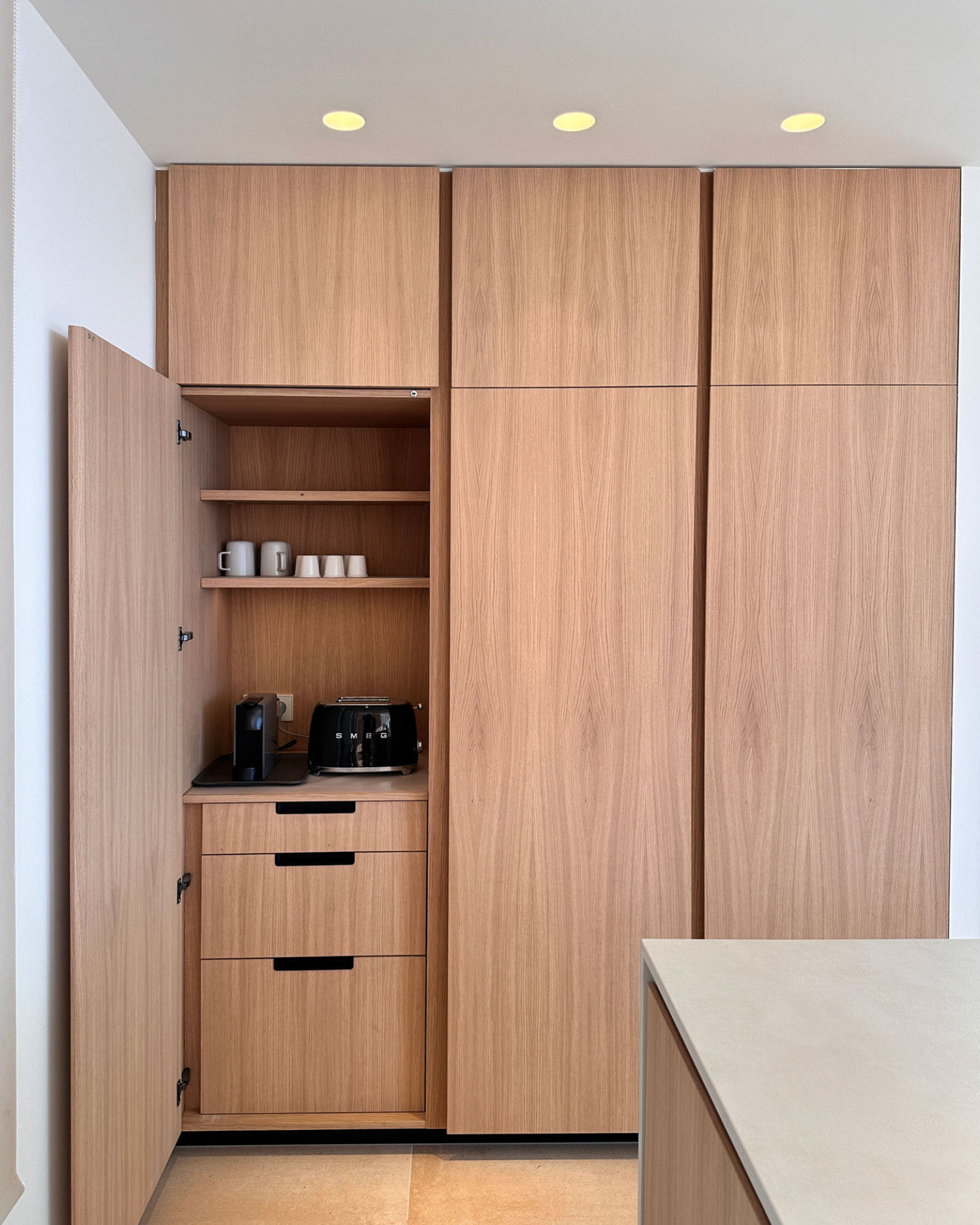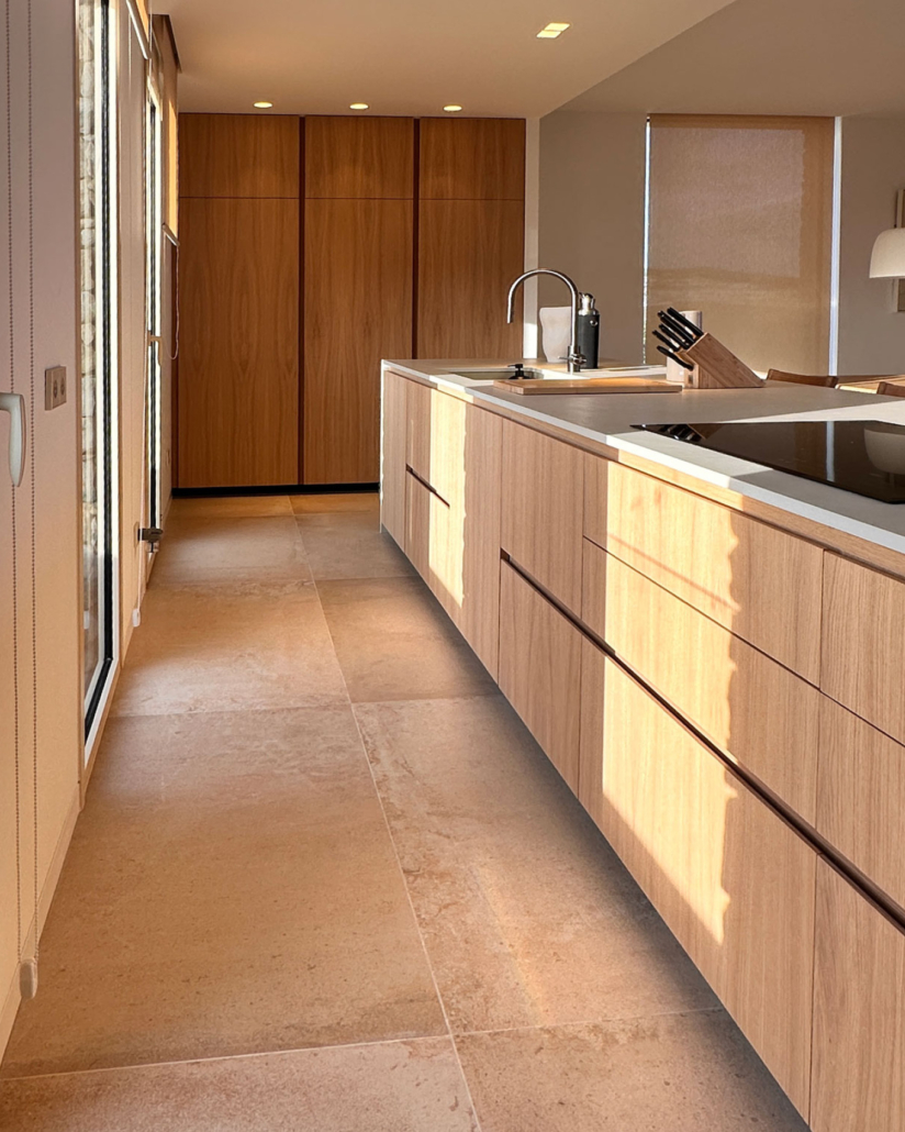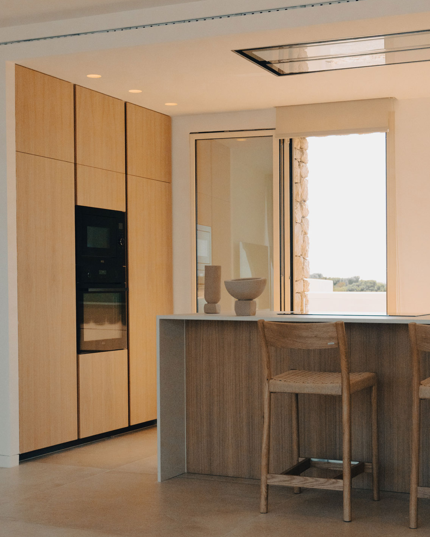 Materiales naturales, tonos suaves y líneas limpias crean un espacio sereno y funcional. La distribución en isla central y mobiliario lateral garantiza comodidad y practicidad, mientras la luz y las vistas hacen que cada comida se sienta especial.