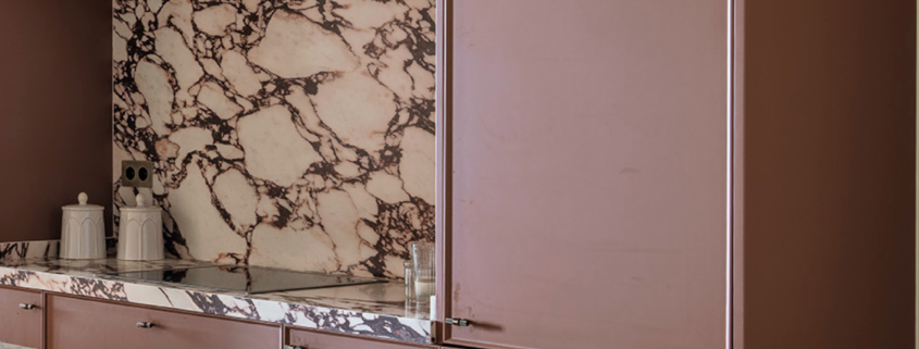 La propuesta combina molduras suaves y carpinterías cálidas con líneas puras y un porcelánico Xtone Viola Rosé en encimera y frontal, que aporta contraste, profundidad y personalidad. «La base clásica está en los detalles; la parte contemporánea llega con las líneas limpias y los electrodomésticos integrados», añade Sara.