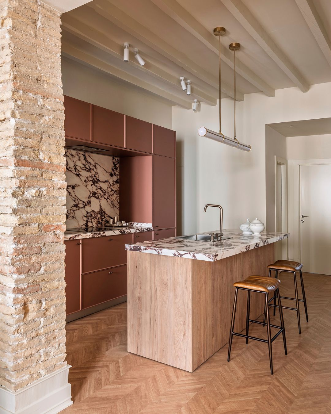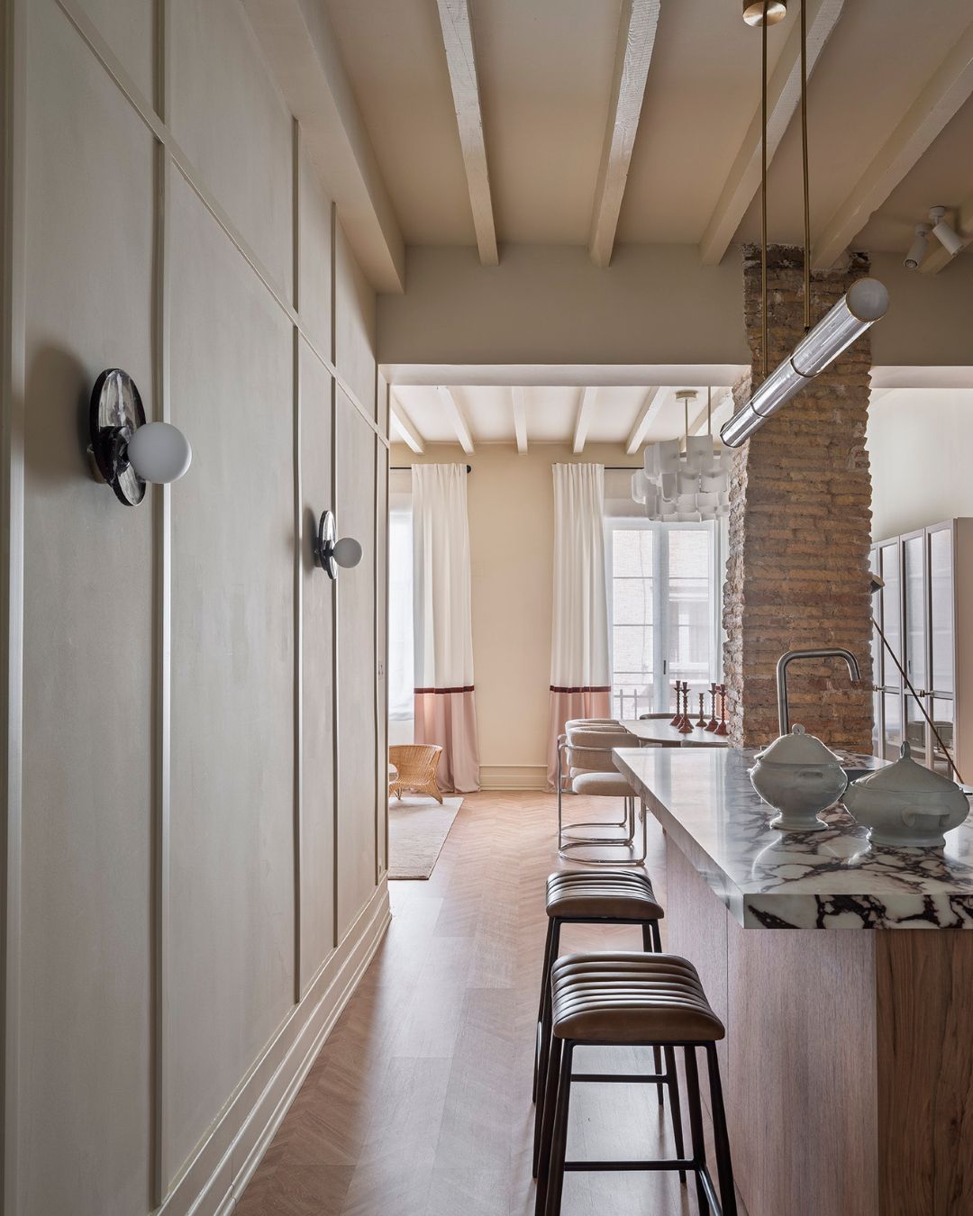 En este apartamento de Zaragoza, la reforma integral recupera la esencia arquitectónica original y la actualiza desde la serenidad. Techos altos, muros nobles y materiales cálidos conviven con una cocina que se convierte en el eje estético y emocional de la vivienda.