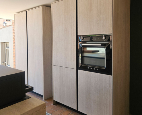 • Cocina Saitra práctica y familiar abierta al salón en una arquitectura singular. Diseño de Corbí cuines i banys